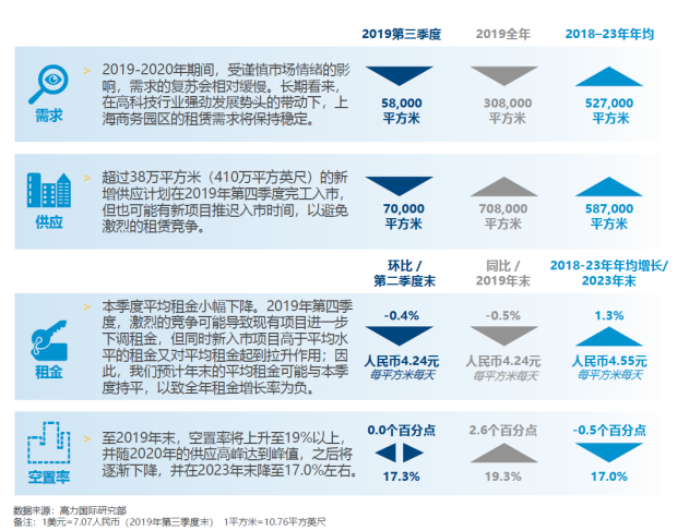 伴随第四季度有超过38万平方米的新增供应入市,市场空置率将大幅上扬,至2019年末升至19%以上,并于2020年全年供应达到峰值后逐渐下降,2023年末回至17%左右。