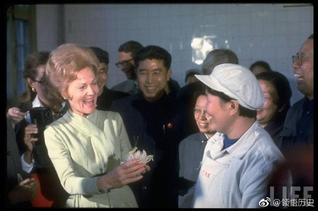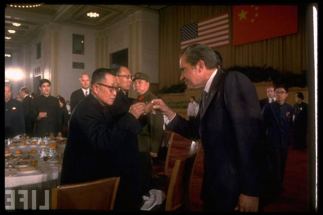 令美方头疼的,不是美食,而是茅台酒。在基辛格看来,这种烈性酒“不做飞机燃料太可惜了,是因为它太易燃”了。负责为尼克松安排日程的秘书表示,在与周恩来碰杯祝酒之前,尼克松已经被提醒不要真正喝中国的烈性酒茅台,只要举起杯来碰一下嘴唇即可。 国宴中,人民大会军乐队演奏了《美丽的亚美利加》(America, The Beautiful) 当尼克松听到演奏《美丽的亚美利加》时非常高兴。因为这是他最喜欢、并指定在就任总统典礼上演奏的乐曲。敬酒时,他特地到乐队前表示感谢,动情的说:这是我到中国后收到的一份大礼!并要给他们发奖。这首歌曲正是周恩来亲自决定的。 1972年2月21日,周恩来在人民大会堂设宴招待尼克松一行,把尼克松和夫人隔开的是红人王洪文,他是中共中央副主席兼中央军委常委。 1972年2月28日,周恩来在上海设宴招待尼克松一行,把尼克松和夫人隔开的是张春桥。 1972年2月28日,周恩来在上海设国宴招待尼克松,张春桥(右一)作陪。九一三事件后,张春桥地位急速窜升,尼克松访华时,当时不担任任何政府职务的张春桥(党政职务上海市委第一书记)竟然在周恩来总理欢迎尼克松的国宴上与周恩来同桌并紧挨尼克松,成了准政府首脑。 周恩来旁边的是翻译冀朝铸,尼克松旁边的是周的政敌张春桥 周恩来会饮酒,酒量不小,但十分节制。在外交场合,周恩来常以酒作为调节、活跃气氛的话题。无论是日内瓦会议,还是尼克松访华、田中访华……凡举行国宴,周恩来都用茅台酒招待宾朋。 1971年,美国的基辛格奉尼克松之命秘密访华。他来我国到时,对中国的一种神秘感使他有点紧张。为了活跃情绪,周恩来在与他们握手时,极力寻找话题与他们 1972年2月,美国总统尼克松来华,为了欢迎第一次访问中国的美国总统,周总理让人在人民大会堂举行了一个十分隆重的晚宴。周总理为了能让尼克松领略中国的饮食文化,亲自拟定了这次宴会的菜肴,规格十分之高,不仅菜品几多,光酒水就准备了8种。当然少不了茅台,周恩来用贮藏了30多年的茅台酒招待贵宾。尼可松知道周总理很能喝酒,便问他,听说中国的茅台曾经得过金奖,喝了茅台酒,再吸烟,点燃的火柴竟引燃了他嘴里的茅台酒。周总理说确实是这样的。周总理为了表示尼克松听到的传言是真的,还亲自让人演示了 一个戏法:把茅台酒倒在了一个小杯子里面,然后周总理把点燃的火柴靠近酒杯,只听呼的一声,茅台酒竟然着火了,冒起了蓝色的火焰。 电视台工作人员拍下了周总理与尼克松满脸喜悦用茅台酒干杯的镜头,并向全世界播送,更使茅台酒伴随着这个历史性的“干杯”而名震世界。 后来在尼克松结束这次访问之后,周总理特地送了尼克松茅台酒作为礼物。尼克松把茅台拿到了美国之后回到了白宫,他也想演示一下周总理点燃茅台的绝技。怎知他一点燃茅台,火苗竟顺着酒水流满了整个桌子,整个桌子瞬间着火了,大家全被吓坏了,赶紧扑灭了火苗,差点把白宫给烧了! 这是中方公开的毛主席在中南海会见来访的尼克松的照片,其实这张照片是Ps的 真实的照片是这样的……中间的是毛的机要秘书张玉凤 从1972年2月1日毛改在中南海游泳池会见外宾开始,基本上都是由秘书张玉凤负责搀扶毛迎接客人,这次,也要让他有精神准备。接着护士长吴旭君又跑去告诉卫士兼理发师周福明———自从月初会见巴基斯坦总统布托以后,基本上卧床的毛就没理过发。另外,周福明还要负责准备会见厅(即书房)的茶水。 毛泽东主席在书房里会见了尼克松总统,这次会晤由原来15分钟的会晤延长至65分钟。用自己喜爱的茉莉花茶接待尊贵的客人。毛泽东还送给尼克松四两(相当于200克)“大红袍”茶,尼克松觉得送得量少。周恩来闻之笑慰尼克松:“主席已经将半壁江山奉送了!”并将其中典故告诉他:“这种茶极为珍贵,每年所产不及500克,我们的主席已将他珍爱的一半家当奉送您了。”尼克松总统听了肃然起敬,并深感荣幸。这款令尼克松总统肃然起敬的茶叶就产自武夷山的“大红袍”母树。现在“大红袍”母树仅存三棵,以其数量稀少、采摘困难(自古就有猴摘茶之说)、滋味醇厚闻名于世。“大红袍”成为中美建交的传奇礼品。 总统夫人会见中国女劳模,中间担任翻译的是章含之。 尼克松夫人参观北京饭店 尼克松夫人参观北京饭店后厨 尼克松夫人在北京饭店的厨房品尝菜肴。众人都饿着肚子呢…… 1972年尼克松夫人参观北京饭店,这是烤鸭的原料。 1972年尼克松夫人参观北京饭店 1972年尼克松夫人参观北京饭店 1972年尼克松夫人参观北京饭店,这是切香肠。 1972年尼克松夫人参观北京饭店 1972年尼克松夫人参观北京饭店 尼克松夫人与北京饭店厨师交流 1972年尼克松夫人参观北京饭店